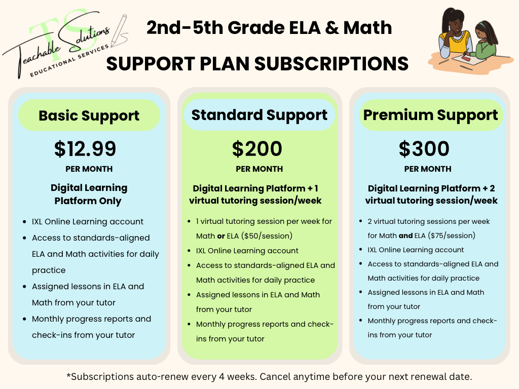 Tutoring for students in grades 2nd-5th starting at $50/per session.